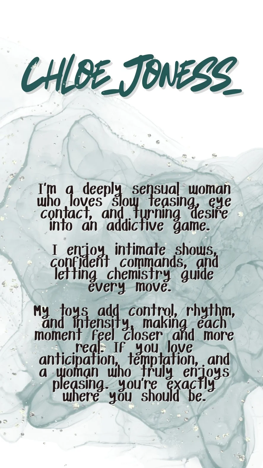 وضعية الكلب, أهيجاو, صفع, رقص مثير, خف الجمل, تعليمات الاستمناء, عرض زيت, تحت التنورة, راعية بقر, يوغا, رقص التويرك, masturbacion con dedos, control lush 2min, قضيب صناعي أو هزاز, رقص التعري, فتيشية القدم, ألعاب جنسية, مص, صدر عارٍ, تصبيع, حلق عميق, إهانة, لعب الأدوار, العادة السرية, نيك الصدر, نشوة, فاضح جدًا, الوضع 69