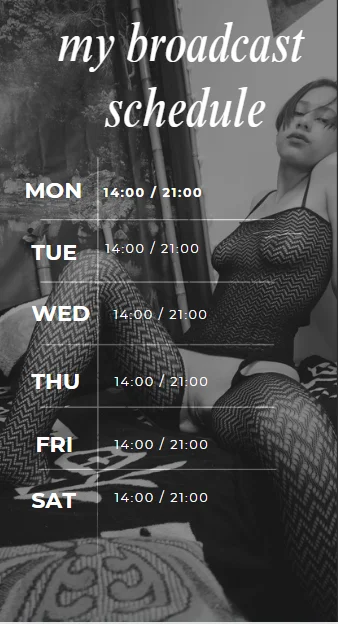 Hello loves.💋💋 ⏰💫SPAIN TIME ⏰💫 MONDAY : 14:00pm - 21.00 pm✔️ TUESDAY: 14:00pm - 21.00 pm✔️ WEDNESDAY: 14:00pm - 21.00 pm✔️ THURSDAY: 14:00pm - 21.00 pm✔️ FRIDAY: 14:00pm - 21.00 pm✔️ SATURDAY: 14:00pm - 21.00 pm✔️ SUNDAY: MY RESTING DAY ❌ ⚜️I'm here to give you the shows of your life. What do you think about this? You will come to play and be naughty in my living room ⚜️