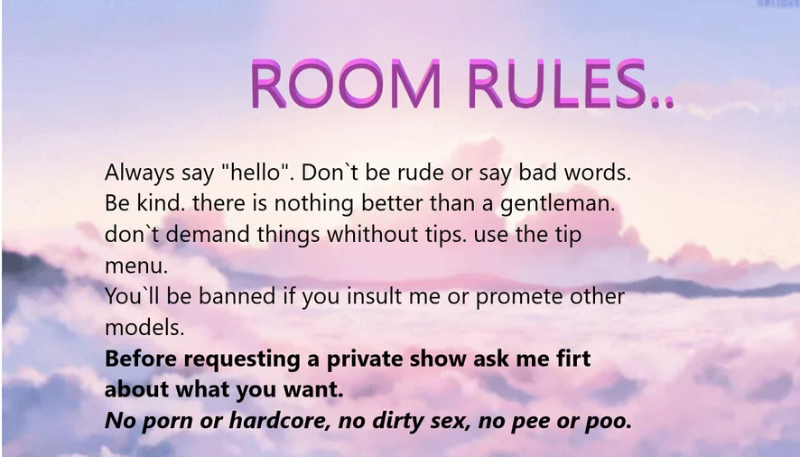 - Don't be rude - Don't ask for free -I don't do personal meetings. -No promotions or names other models in my room (you will be banned) ♥RESPECT FOR ALL♥