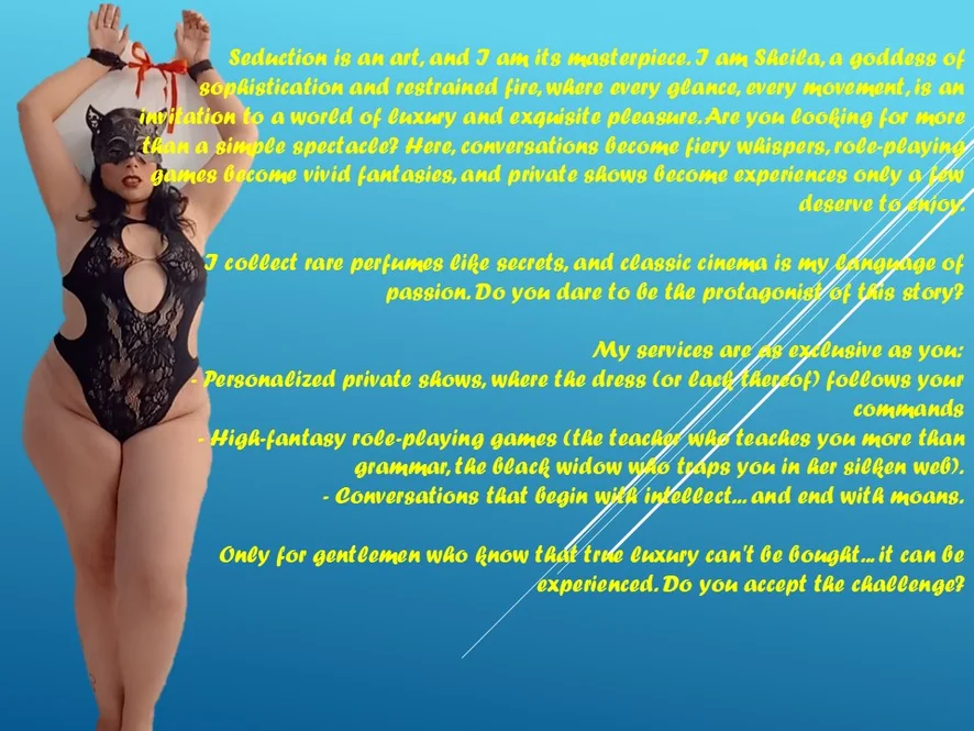 Seducción es un arte, y yo su obra maestra. Soy Sheila, una diosa de sofisticación y fuego contenido, donde cada mirada, cada movimiento, es una invitación a un mundo de lujo y placer exquisito. ¿Buscas más que un simple espectáculo? Aquí, las conversaciones se convierten en susurros ardientes, los juegos de rol en fantasías vividas, y los shows privados… en experiencias que solo unos pocos merecen disfrutar. Colecciono perfumes raros como secretos, y el cine clásico es mi lenguaje de pasión. ¿Te atreves a ser el protagonista de esta historia?* Mis servicios son tan exclusivos como tú: - Shows privados personalizados, donde el vestido (o la falta de él) sigue tus órdenes - Juegos de rol de alta fantasía (la profesora que te enseña más que gramática, la viuda negra que te atrapa en su telaraña de seda…). - Conversaciones que empiezan con intelecto… y terminan con gemidos. Solo para caballeros que saben que el verdadero lujo no se compra… se experimenta. ¿Aceptas el reto?